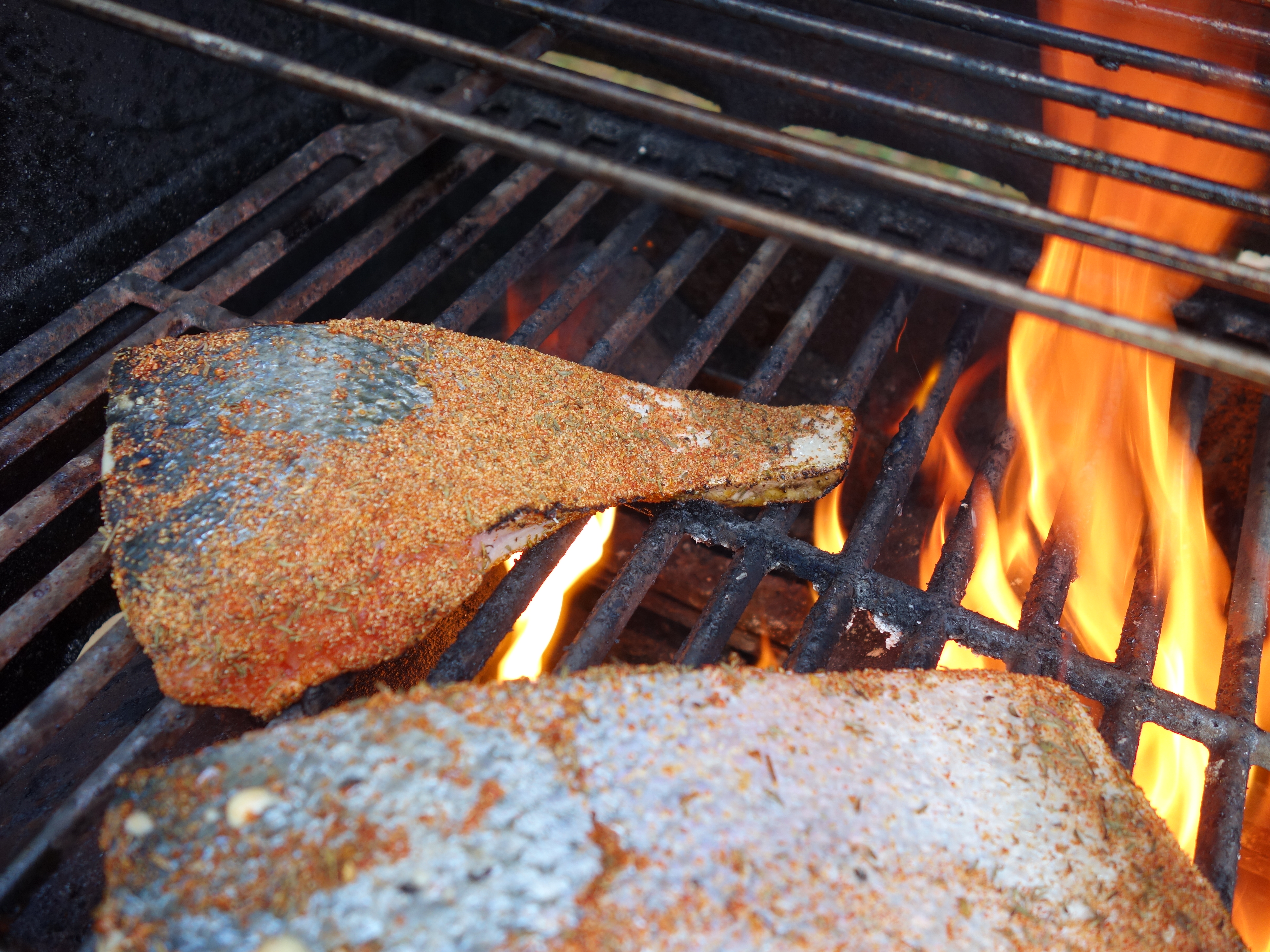 Teimme liekitettyä cajunlohta, grillattua bataattia ja guacamolea. Liekitetty cajunlohi kuuluu ns. bravuureihin, se on ollut yksi suosikeistamme jo pitkään, vaikka mustaksi palanut pinta ei ehkä niin kaunis olekkaan. Idea ruuassa on se, että kala pinnoitetaan paksulla kerroksella cajun mausteseosta, jonka jälkeen maustepinta kastetaan juoksevassa rasvassa ja grillataan/paistetaan, niin että mausteet palavat, niinpä ruuasta tulee pitkälit mustaa.