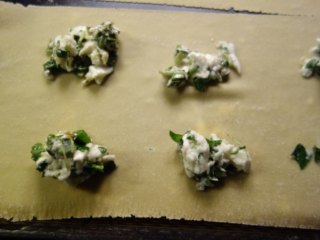 Laita teelusikalla täytettä pineinä kekoina pastalevylle, jätä reilusti tilaa täytekekojen väliin. Aseta toinen pastalevy täytteen päälle. Varmista, että pastalevyjen väliin ei jää ilmaa. Painele pastalevyt yhteen raviolitäytteen ympäriltä. Leikkaa raviolit irti toisistaan. Keitä ravioleja 2-4 minuuttia reilusti suolatussa vedessä. Nosta raviolit varovasti reikäkauhan avulla siivilään ja huuhtele varoivasti kylmällä vedellä. Kylmä vesi lopettaa pastan kypsymisen ja estää ravioleja tarttumasta toisiinsa. Liian kova vesisuihku voi kuitenkin repiä pastan rikki, joten älä avaa hanaa täydellä teholla.