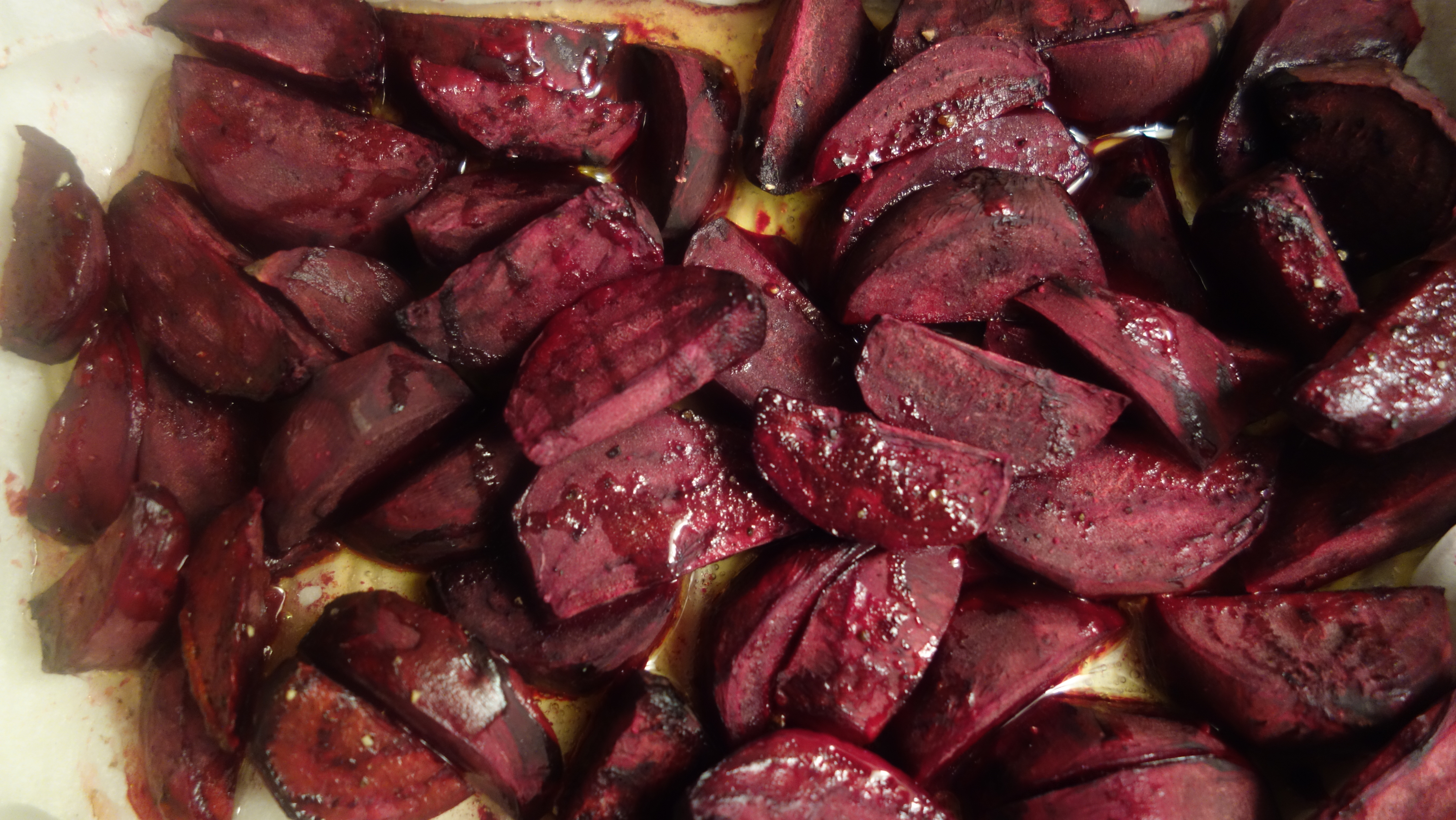 Lämmitä uuni 200 asteeseen. Kuori ja lohko punajuuret, aseta ne uunivuokaan, kaada hieman öljyä punajuurien päälle. Kääri Valkosipulit folioon. Paista valkosipuleita ja punajuuria puoli tuntia uunissa.