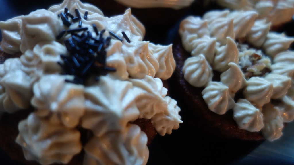 Pehmennä tuorejuusto kulhossa, vatkaa hiljalleen sekaan tomusokeri, mausta lopuksi lakritsijauheella. Pursota kuorrutetta jäähtyneiden kuppikakkujen päälle. Käytin 0,5 cm tähtityllaa kuppikakkujen koristeluun.