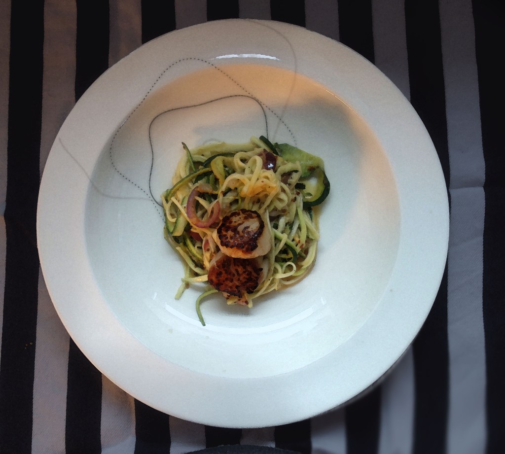 Jääkaapista löytyi kesäkurpitsa ja pakkasesta kampasimpukoita, joten päätin kokeilla tehdä kesäkurpitsasta ”pastaa” ja siihen tietenkin rapeaksi paistetut kampasimpukat kylkeen!