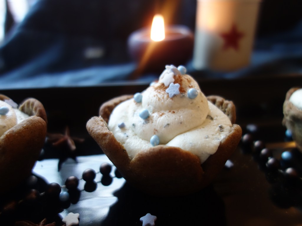 Uusia ideoita ja perinteisiä makuja! Piparkakut leivotaan kupin muotoon, täytetään piparimaustetuilla karamelisoiduilla omenilla ja sinihomeella maustetulla kermavaahdolla.