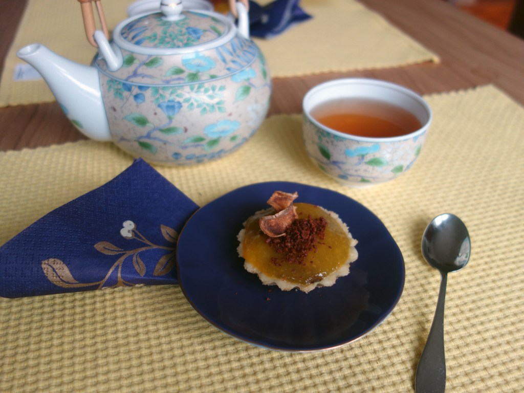 Kaada suklaa ganache kakkupohjiin, anna ganachen jähmettyä. Kaada mangohyydyke kakkujen päälle kun se on melkein täysin hyytynyttä. Ripottele mangohyydykkeen päälle paahdettu kookoskerma. Aseta 2 viipaletta friteerattua inkivääriä jokaisen kakun päälle.