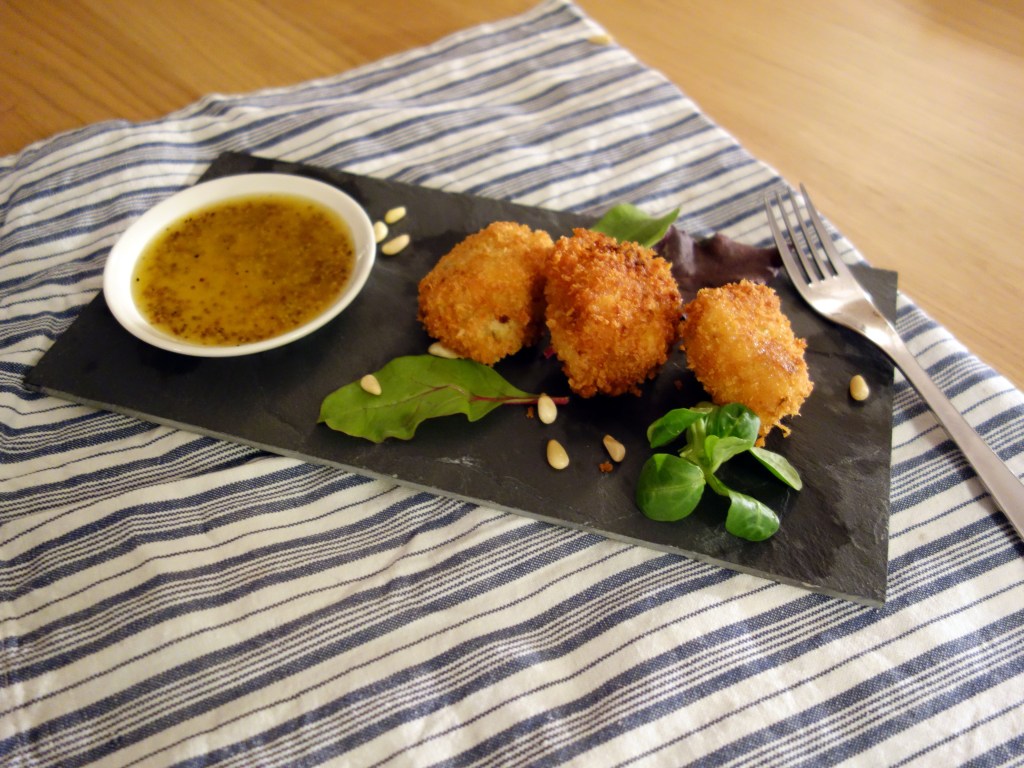 Tarjoile aranciinit vinegrettin, vihersalaatin ja pinjansiemenien kera.
