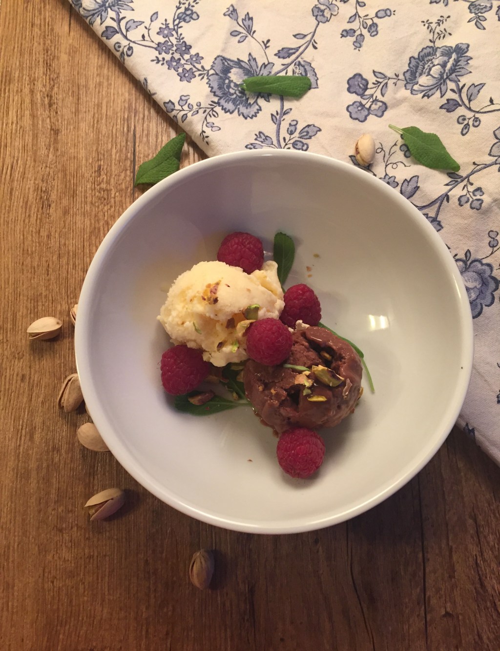 Yrtit sopivat eriniomaisesti maustamaan makeita jälkiruokia. Olen aiemmin tehnyt rosmariinijäätelöä, tällä kertaa testissä salviajäätelö, joka saa seurakseen makean kahvisuklaajäätelön ja paahdettuja pistaaseja.