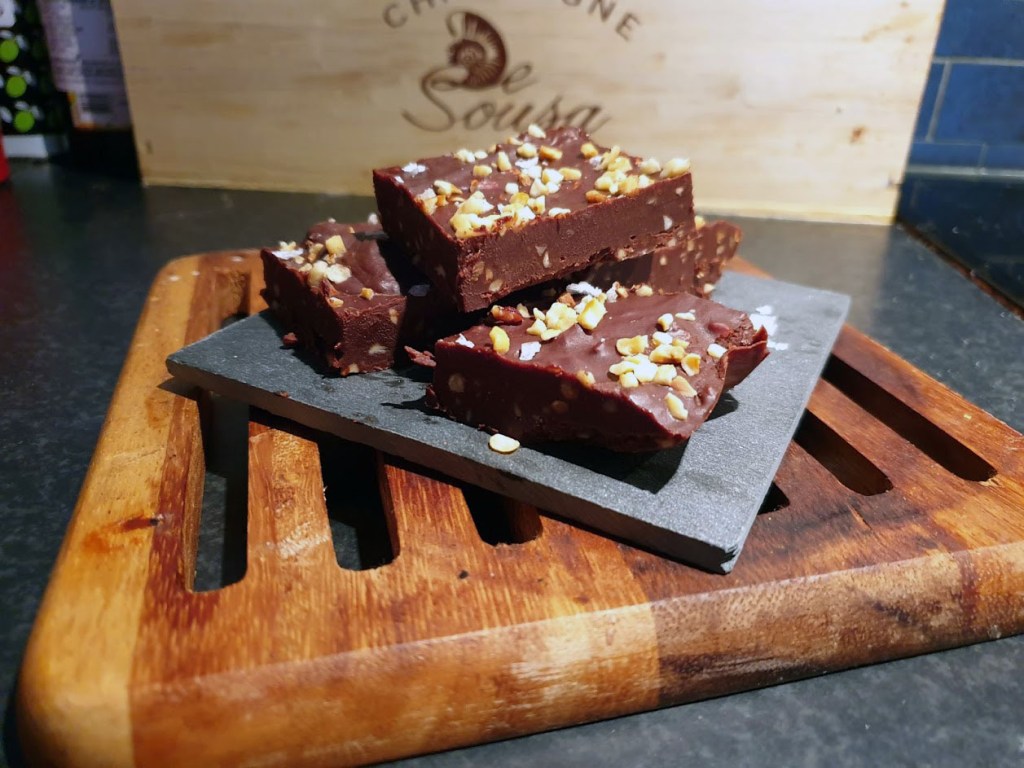 Kaada suklaamassa leivinpaperilla vuorattuun uunivuokaan. Ripottele pinnalle pähkinärouhetta sekä Maldon suolaa. Laita fudge jääkaappiin jähmettymään.
