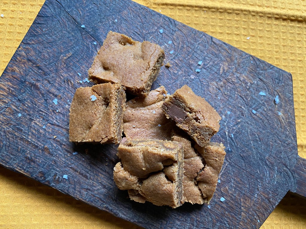 Lämmitä uuni 175 asteeseen. Sekoita keskenään ruskistettu voi ja fariinisokeri. Lisää kananmuna ja keskenään sekoitetut kuivat aineet ja sekoit taikina tasaiseksi. Lisää lopuksi halutessasi rouhe. Painele taikina leivinpaperilla vuoratun uunivuoan (20x20cm) pohjalle. Paista 18-22 minuuttia uunin keskitasolla.